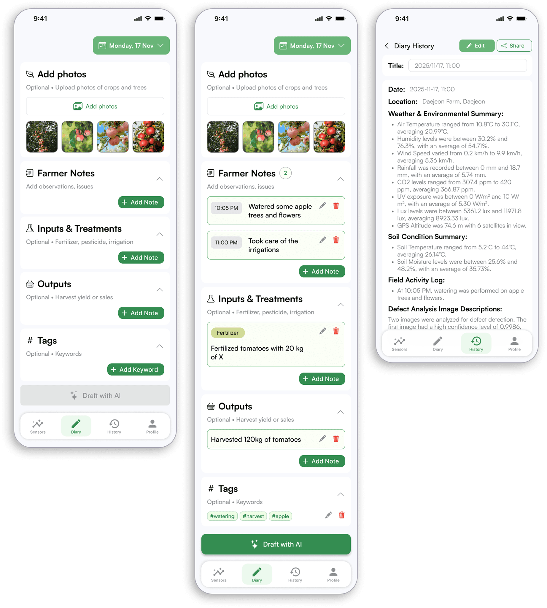 Log, track and share your farming activities with your team instantly, with live sensor data and continuous environmental monitoring for immediate decision-making.